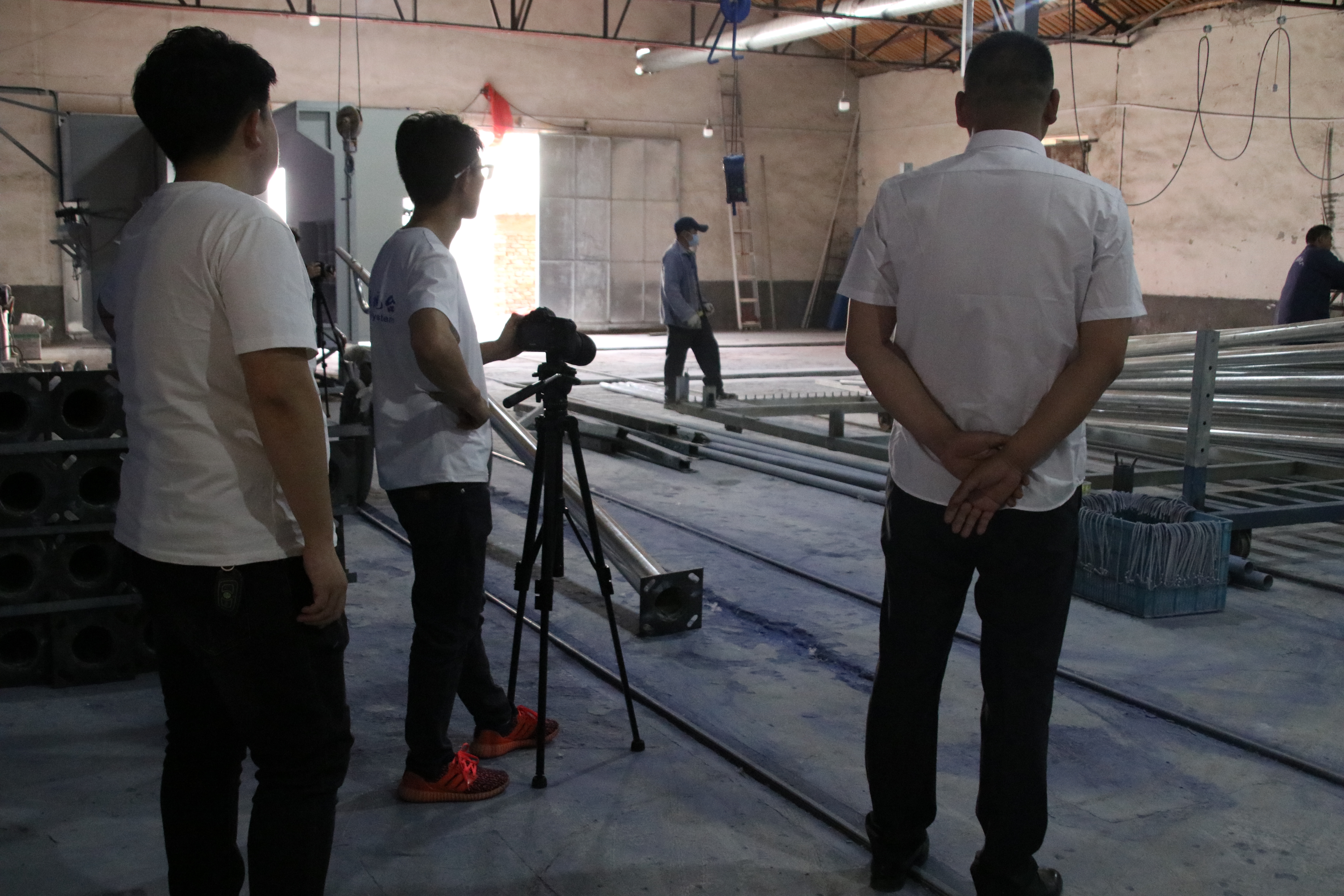 訪談結(jié)束后,程董事長親自帶隊參觀了廠房,還現(xiàn)場演示了太陽能路燈燈桿的噴塑技術(shù);