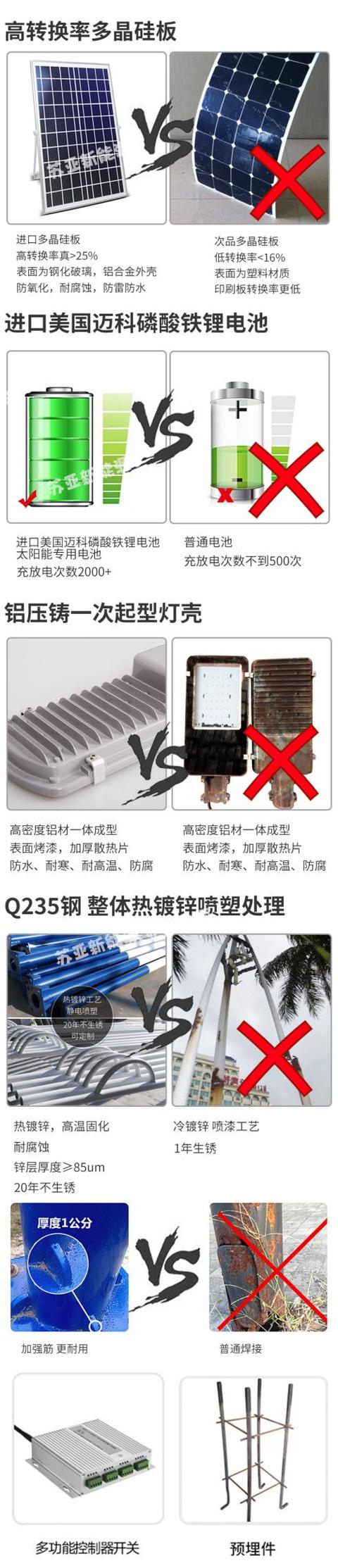 影響太陽能路燈壽命因素有:控制器、電線、燈殼、密封圈、電池、燈桿、太陽板、預埋件、加強筋
