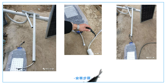 3、太陽能板架套在燈桿上,線從穿線孔穿出,太陽板轉到朝南向,固定好。