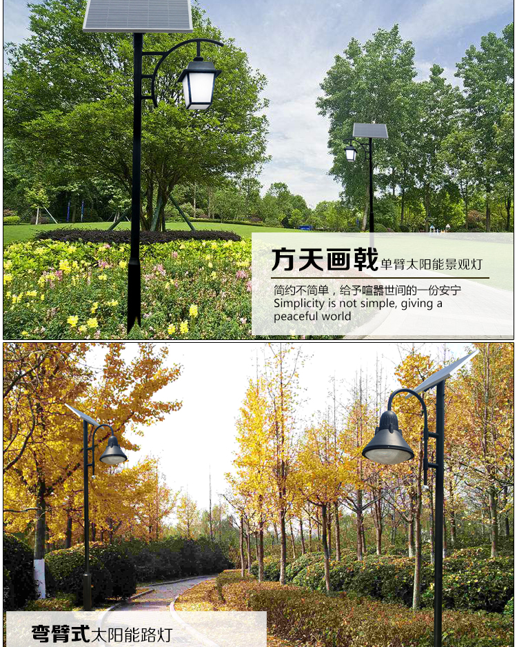 太陽能庭院燈是采用太陽能技術與節能LED完美結合的開發產品,外觀精致方便實用,操作簡單,而且內置高性能聚合物電芯,容量可達4000mAH-5200mAh,利用太陽能光源轉換進行充電,全面提升了無電地區的生活質量。